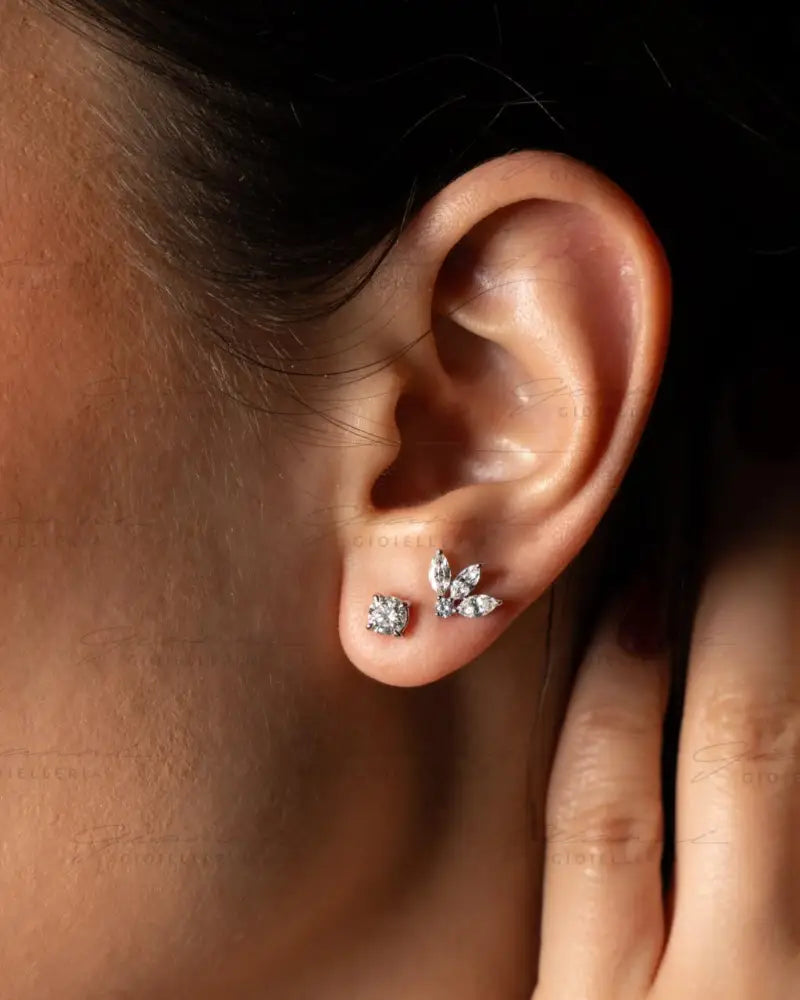 La combinazione di forme e luci crea un gioco raffinato e dinamico, mentre l’oro bianco esalta la purezza delle pietre preziose, rendendo questo orecchino un accessorio perfetto per ogni occasione.