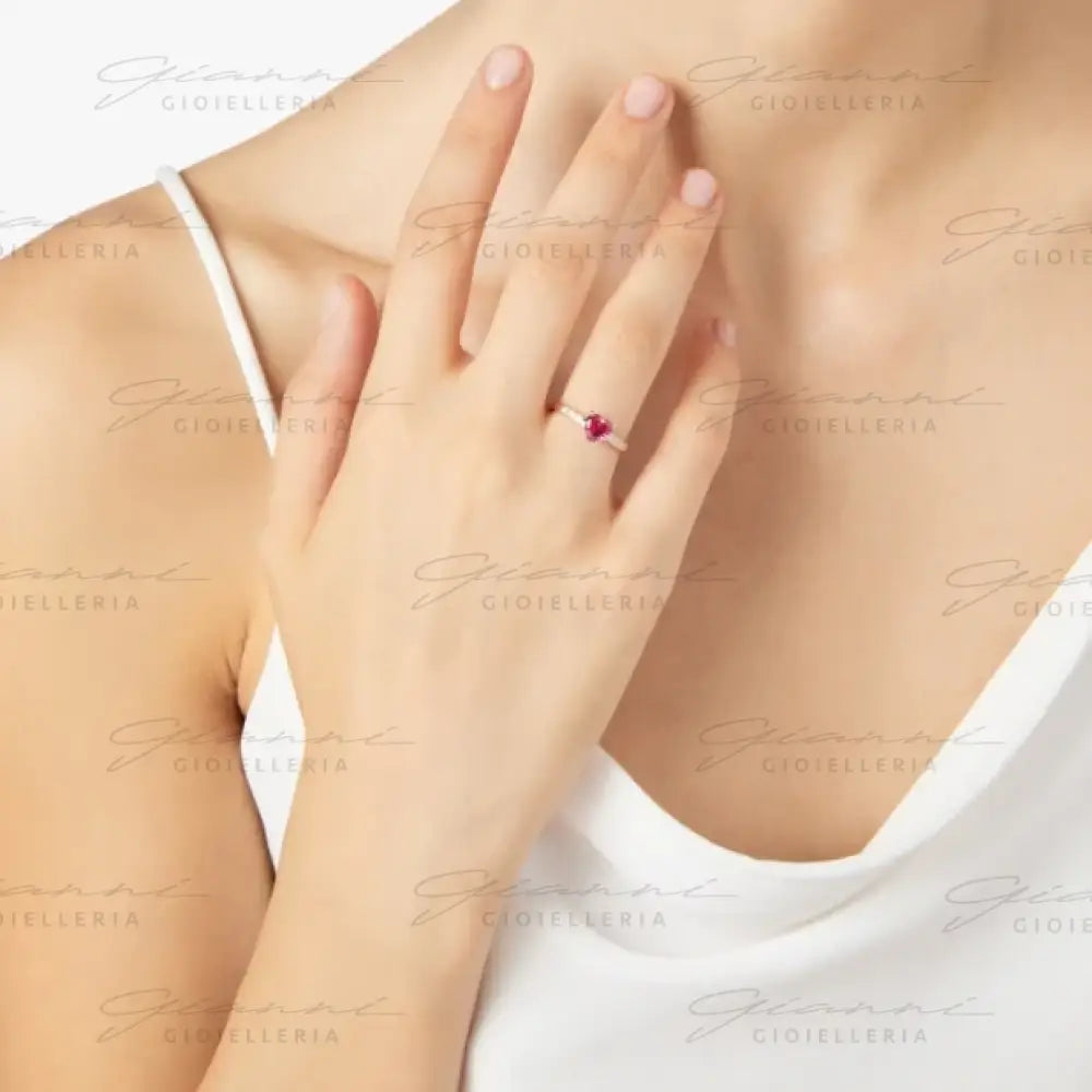 Anello Cuore in oro rosa 9K con 1 rubino sintetico (ct 0.87) e 6 diamanti bianchi (ct 0.13).