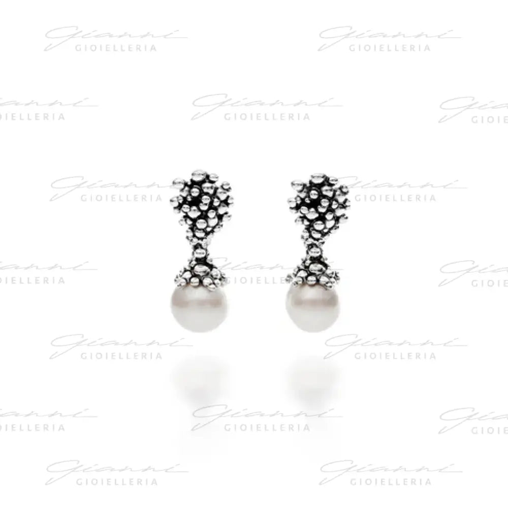 Eleganti decori, ispirati alla suggestione delle bollicine di champagne, per questi orecchini in argento realizzati completamente a mano, in azienda, con la tecnica antica della fusione a cera persa. Un incontro luminoso tra le perle d'acqua dolce e l'argento brunito.