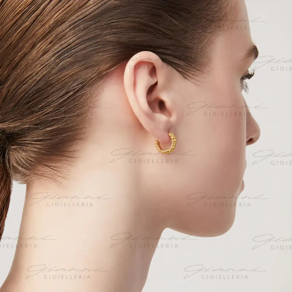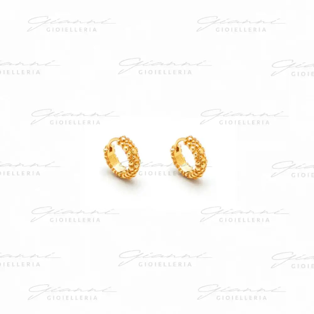 Abbelliti da un decoro Perlage, questi deliziosi orecchini in argento dorato montano una nuova chiusura "a scatto", pratica ed elegante. Realizzati a mano in azienda.