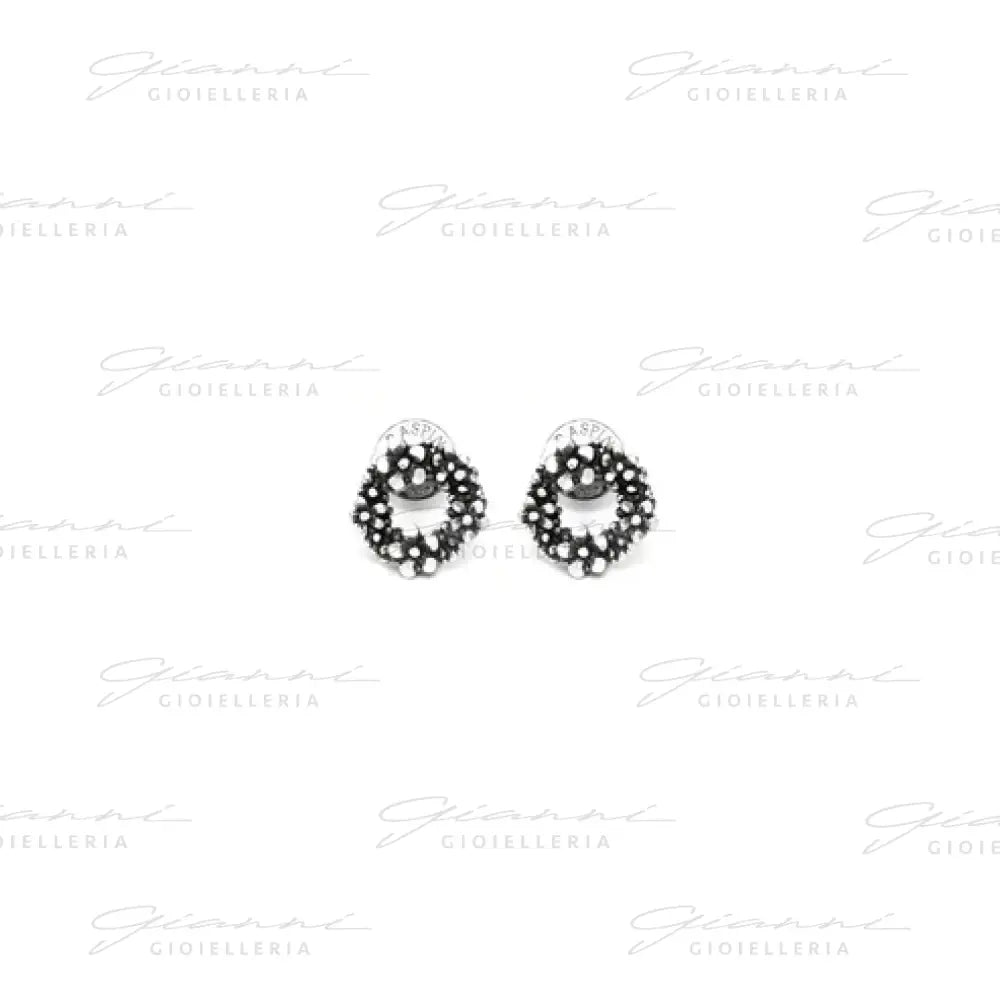 Piccoli fiori luminosi come cristalli. Gli orecchini bottone Millefiori sono realizzati a mano tramite fusione a cera persa. Particolare luminosità è sprigionata dai minuscoli e graziosi petali in argento diamantati.