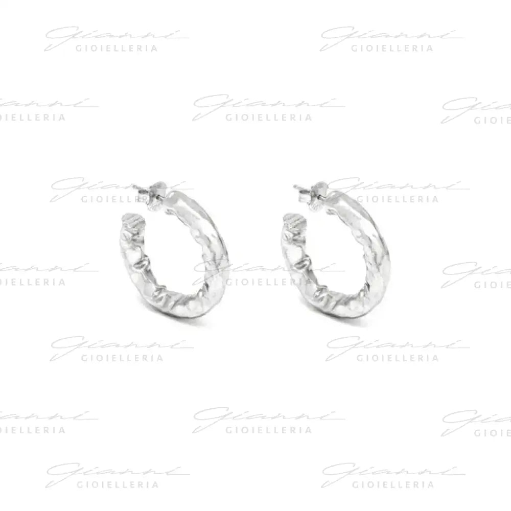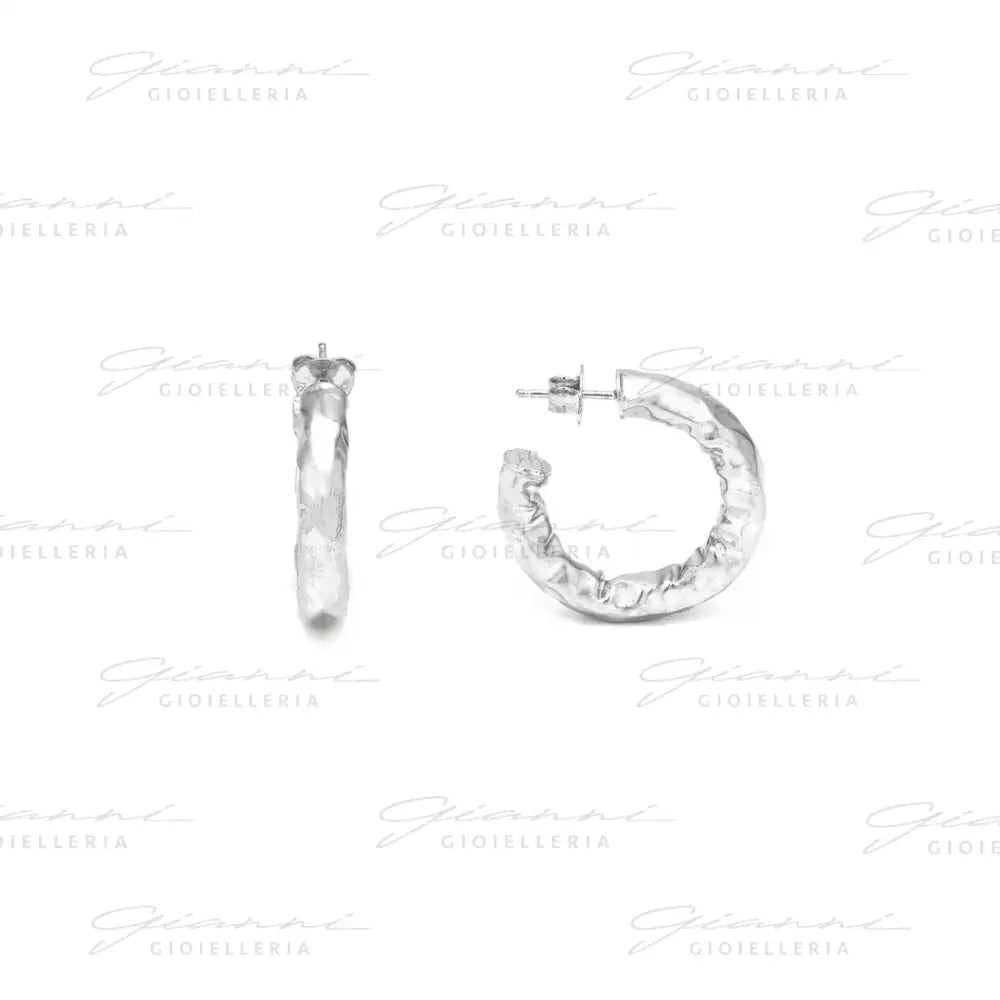 Luce oltre la forma. Leggeri ed eleganti, questi orecchini riflettono la luce naturale in ogni direzione, illuminando il volto. Essi vengono realizzati in azienda mediante lastra d'argento martellata a mano.