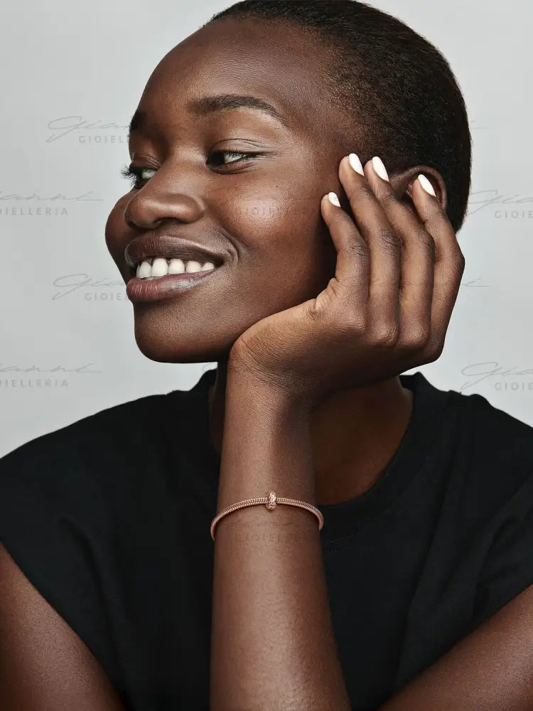 Aggiungi al tuo look questa maglia iconica con la Clip Geometrica Slim. Ispirata alla nuova maglia geometrica, questa clip alterna forme sferiche e piramidali che creano meravigliosi effetti di luce. Realizzata nell'esclusiva lega metallica placcata oro rosa 14k è perfetta per essere indossata su bracciali e collane a maglia geometrica per un look coordinato. La clip presenta inserti in silicone all'interno, pertanto non può essere inserita sulle filettature e resterà ferma in posizione sulla catena mentre ti muovi, distanziando i charm.
