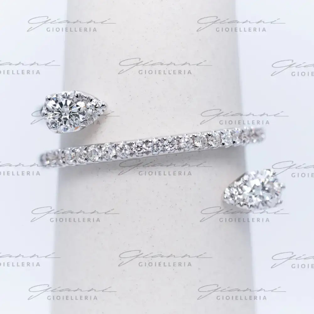 I diamanti taglio brillante, incastonati con cura lungo le linee intrecciate, catturano la luce donando una luminosità intensa e sofisticata.