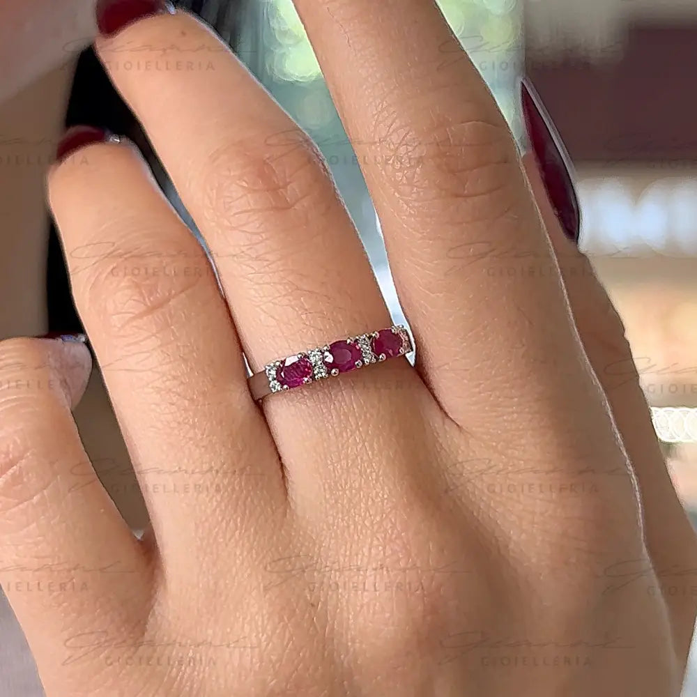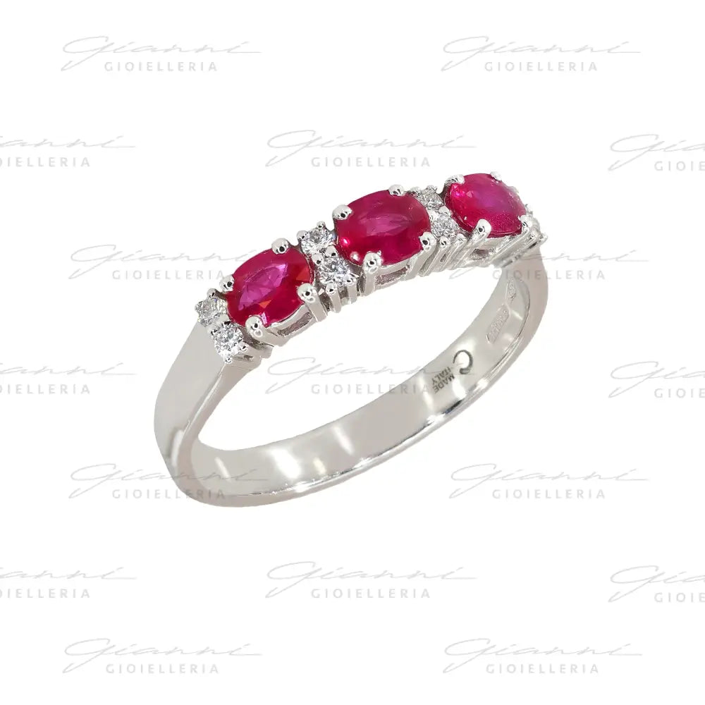 Un’eleganza intensa che racconta la bellezza del colore. Questo anello Crivelli in oro bianco 18 kt è impreziosito da tre rubini, disposti armoniosamente per esaltare la profondità del loro rosso vivo e brillante. A incorniciarli, diamanti taglio brillante finemente incastonati, che donano luce e contrasto con raffinata discrezione.
