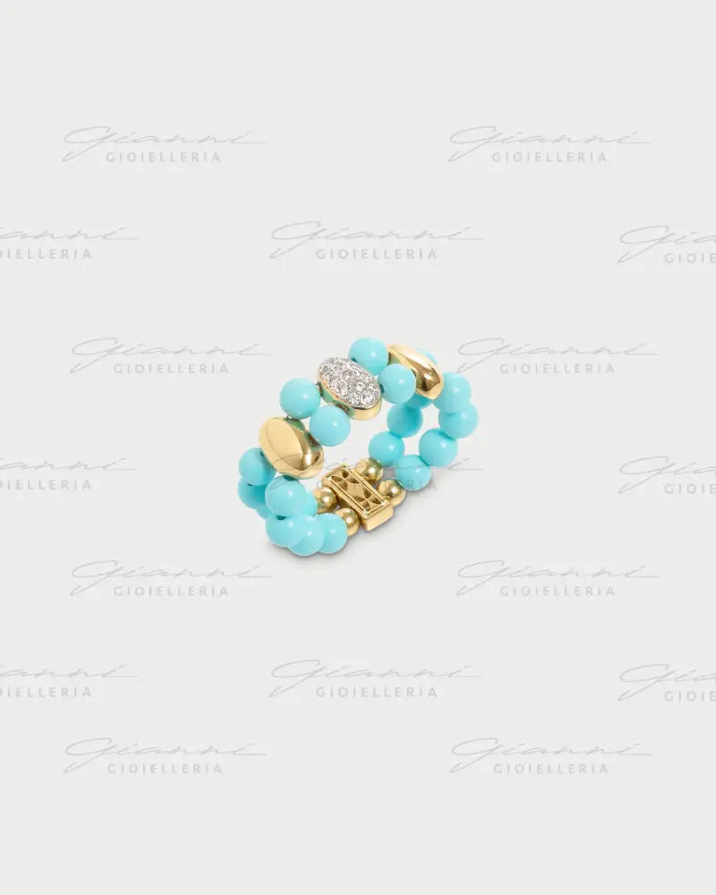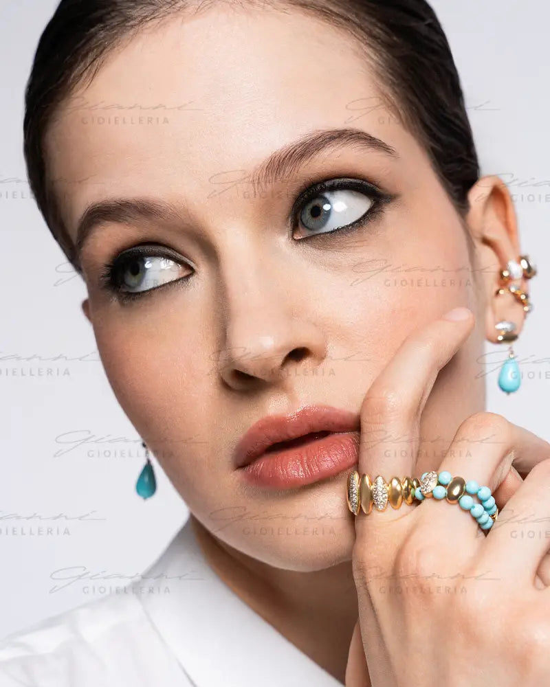I gioielli si ispirano a forme morbide, impreziositi da dettagli unici come perle luminose e pietre turchesi, che regalano tocchi di colore e vitalità.