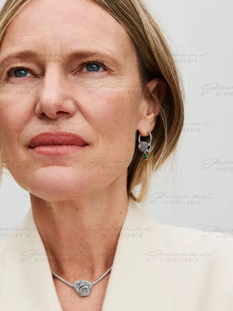 Celebra l'eleganza con il Charm Rosa Scintillante, realizzato in Argento Sterling 925. Disegnato con cura per rappresentare la natura delicata del fiore, ogni lato del charm presenta i petali con un effetto stratificato che forma la rosa in fiore. I petali sono decorati da un luminoso pavè di zirconia cubica incolore. Due cristalli verdi creati dall'uomo posizionati nella parte inferiore del charm rappresentano le foglie della rosa. Celebra la persona che ami con questo charm romantico.