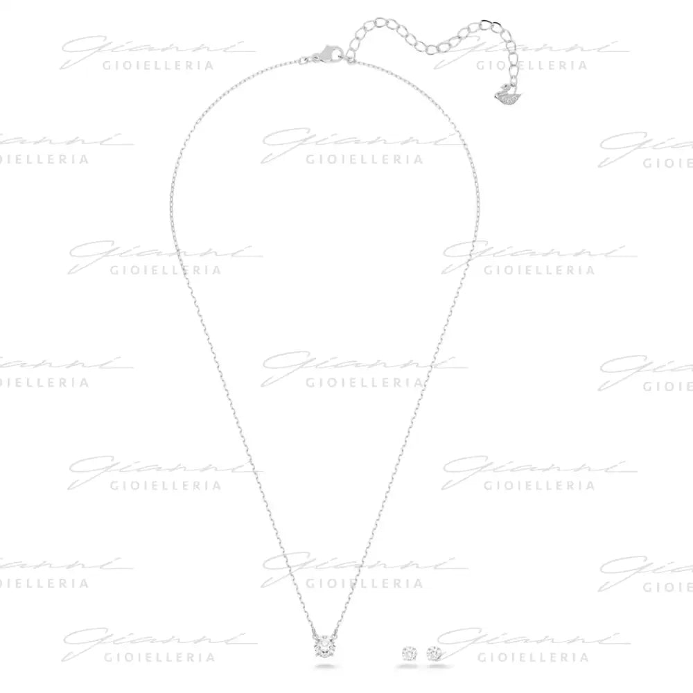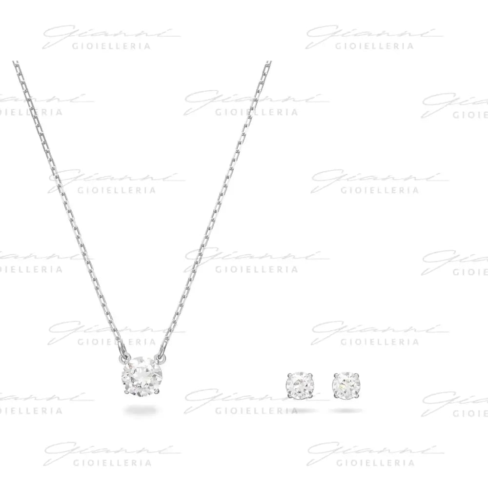 Crea composizioni uniche con questo set. Realizzata in un esclusiva lega metallica, la parure è composta da una collana completata da un Cristallo Swarovski colorazione Crystal Clear; e da un paio di orecchini composti da un punto luce che doneranno una Brillantezza mozzafiato al tuo look.